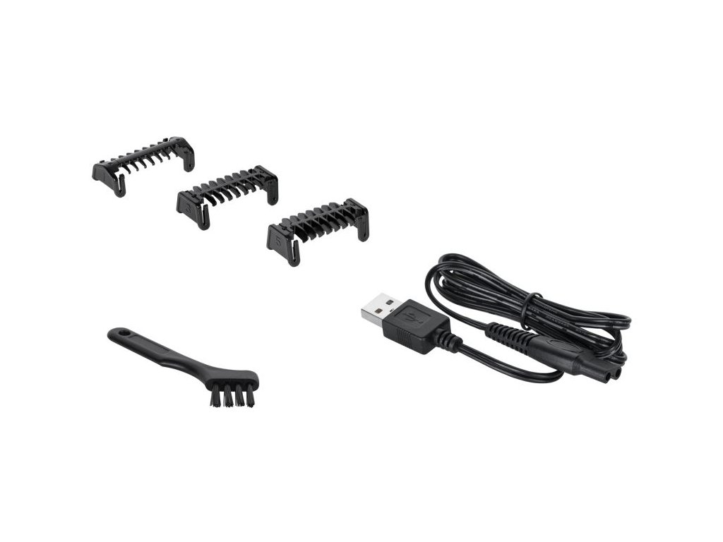 Obsah balenia: 3 hrebeňové nástavce, čistiaca kefka, USB kábel, návod na použitie