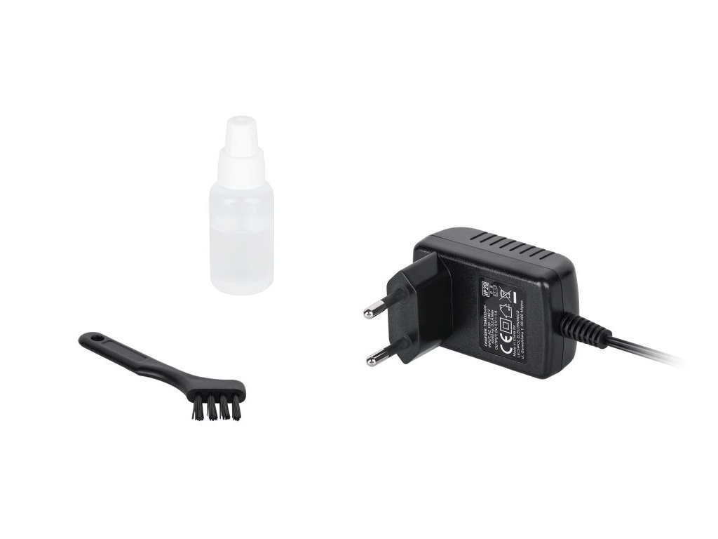 Obsah balenia: sieťová nabíjačka, nabíjacia stanica, 4 hrebeňové nástavce, čistiaca kefka, konzervačný olej, návod na použitie